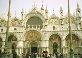 ベニスを代表する風景は、ゴンドラとサン・マルコ広場の周辺の景色です。サン・マルコ広場はテレビや映画の舞台としてもしばしば登場するので、誰もが見覚えのある場所だと思います。ヨーロッパで始めてコーヒーを出したカフェ・フローリアン、ベニス共和国を支配したドゥカーレ宮殿、純金の装飾がまばゆいサン・マルコ寺院(写真)などがあり、何と言ってもサン・マルコ広場は仮装行列で有名なベニスのカーニバルの舞台でもあります。